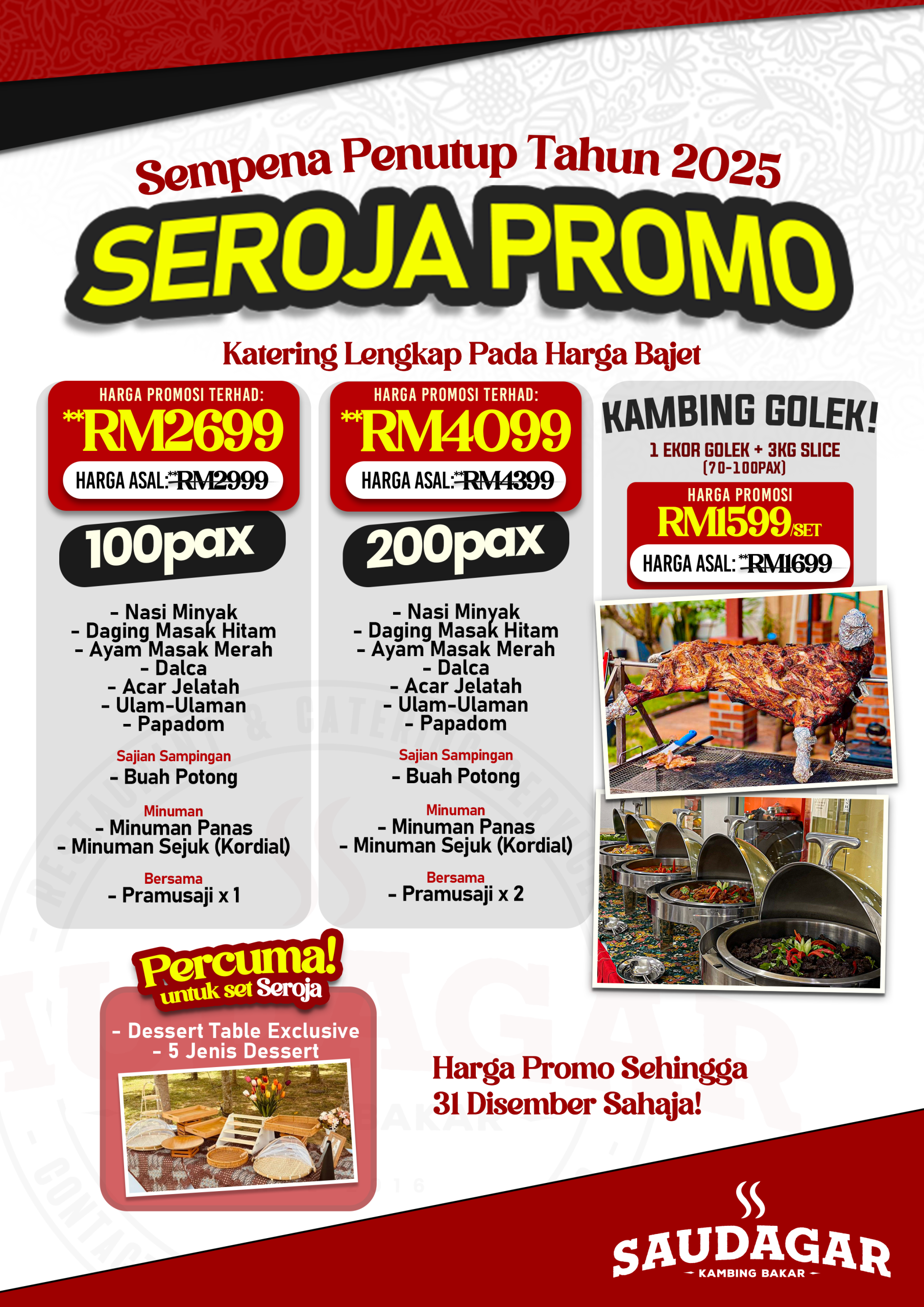 Saudagar Katering menyediakan servis katering lengkap, aqiqah, dan kambing golek lembut secara live untuk majlis di Kuala Lumpur, Selangor dan Putrajaya. Kami dikenali sebagai pakar kambing golek lembut dan juicy, citarasa sos yang berbeza, dengan fokus kepada rasa, tekstur daging, portion berbaloi dan pengurusan majlis yang teratur.